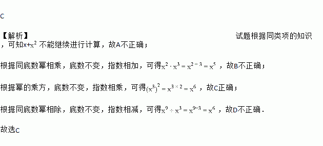 A. x+x2=x3 B. x2•x3=x6 C. (x3)2=x6 D. x9÷x3=x3