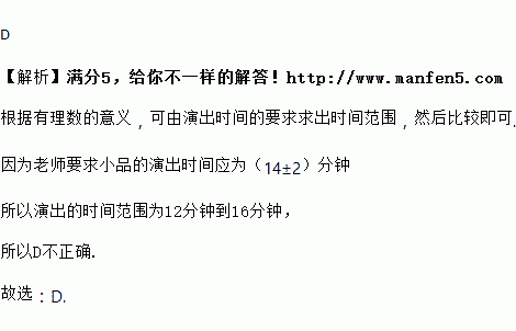 联欢会上,老师要求小品的演出时间应为(14±2)分钟,下面4次排练所用的时间中不符合要求的是( )