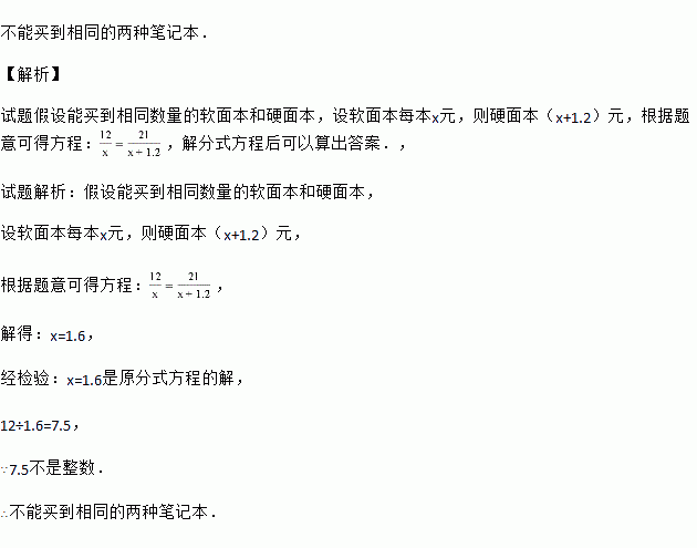 小明用12元买软面笔记本,小丽用21元买硬面笔记本,已知每本硬面笔记本比软面笔记本贵1.2元,小明和小丽能买到相同数量的笔记本吗?
