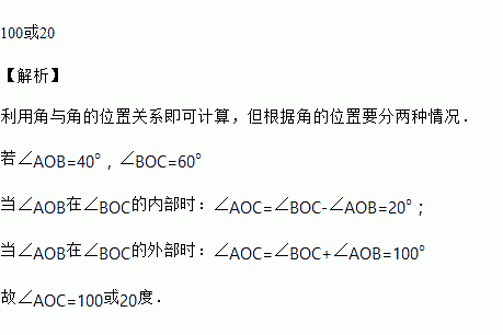 若∠AOB=40°,∠BOC=60°,则∠AOC=________度.