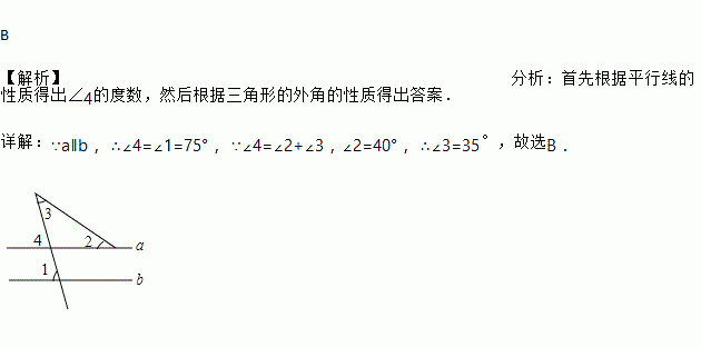 如图,直线a∥b,∠1=75°,∠2=40°,则∠3的度数为( )