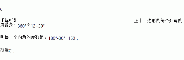 C 【解析】正十二边形的每个外角的度数是:360°÷12=30°, 则每一个内角的度数是:180°-30°=150, 故选C.