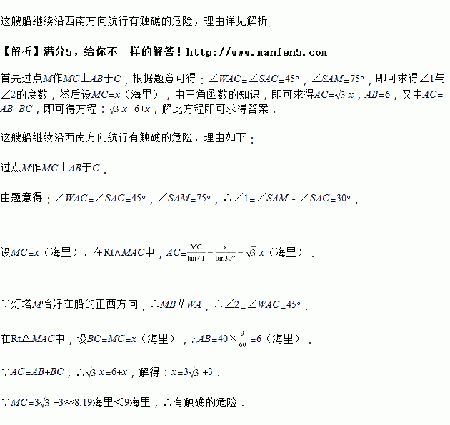 海里以内的海区有暗礁,这艘船继续沿西南方向航行是否有触礁的危险?为什么?(参考数据:![]()