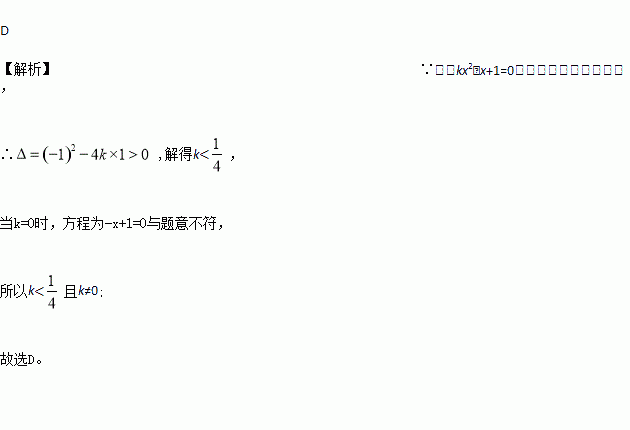 已知方程—x+1=0 有两个不同的实数根,则k的取值范围是( )