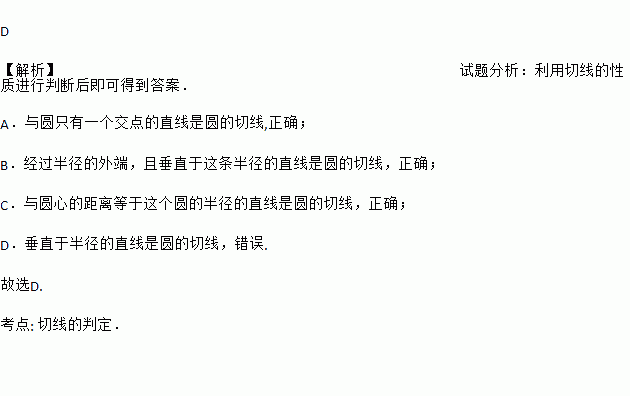 D 【解析】试题分析:利用切线的性质进行判断后即可得到答案. A.与圆只有一个交点的直线是圆的切线,正确; B.经过半径的外端,且垂直于这条半径的直线是圆的切线,正确; C.与圆心的距离等于这个圆的半径的直线是圆的切线,正确; D.垂直于半径的直线是圆的切线,错误. 故选D. 考点: 切线的判定.