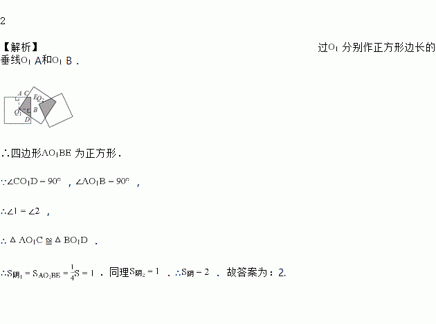 如图,三个边长均为的正方形重叠在一起,,是其中两个正方形的中心,则阴影部分的面积是___________.