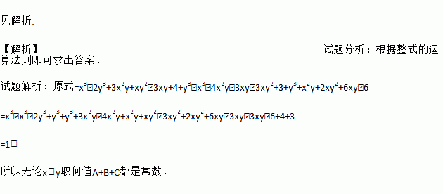 见解析. 【解析】试题分析:根据整式的运算法则即可求出答案. 试题解析:原式=x3﹣2y3+3x2y+xy2﹣3xy+4+y3﹣x3﹣4x2y﹣3xy﹣3xy2+3+y3+x2y+2xy2+6xy﹣6 =x3﹣x3﹣2y3+y3+y3+3x2y﹣4x2y+x2y+xy2﹣3xy2+2xy2+6xy﹣3xy﹣3xy﹣6+4+3 =1, 所以无论x.y取何值A+B+C都是...