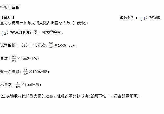 学期结束前,学校想调查学生对七年级数学实验教材的意见,特向七年级400名学生进行问卷调查,其结果如下表:
