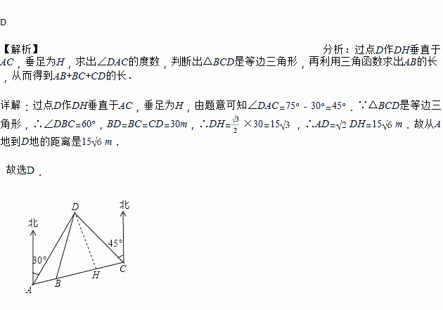 “奔跑吧,兄弟!”节目组,预设计一个新的游戏:“奔跑”路线需经A、B、C、D四地.如图,其中A、B、C三地在同一直线上,D地在A地北偏东30°方向、在C地北偏西45°方向.C地在A地北偏东75°方向.且BD=BC=30m.从A地到D地的距离是( )
