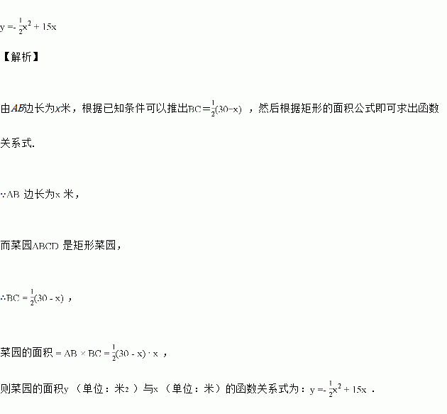 如图,用一段长为30米的篱笆围成一个一边靠墙(墙的长度不限)的矩形菜园ABCD,设AB边长为x米,则菜园的面积y(单位:米2)与x(单位:米)的函数关系式为多少?