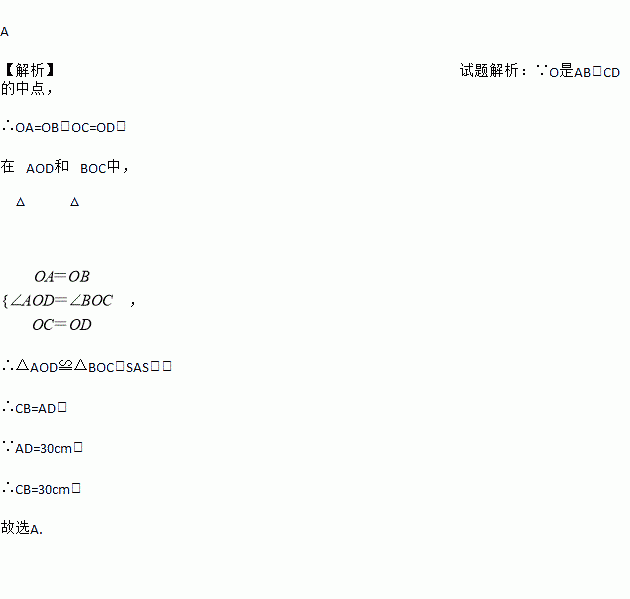 某大学计划为新生配备如图①所示的折叠凳.图②是折叠凳撑开后的侧面示意图(木条等材料宽度忽略不计),其中凳腿AB和CD的长相等,O是它们的中点.为了使折叠凳坐着舒适,厂家将撑开后的折叠凳宽度AD设计为30 cm,则由以上信息可推得CB的长度也为30 cm,依据是( )