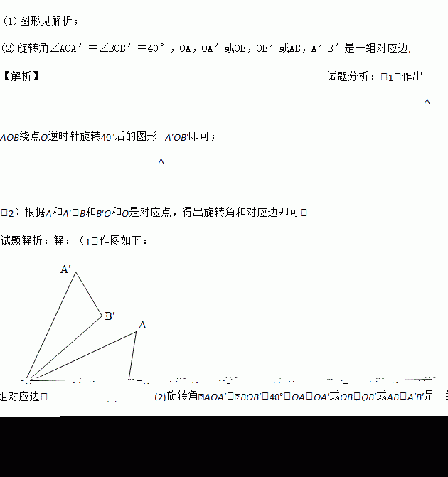 (1)图形见解析; (2)旋转角∠AOA′=∠BOB′=40°,OA,OA′或OB,OB′或AB,A′B′是一组对应边. 【解析】试题分析:(1)作出△AOB绕点O逆时针旋转40°后的图形△A′OB′即可; (2)根据A和A′,B和B′O和O是对应点,得出旋转角和对应边即可. 试题解析:【解析】 (1)作图如下: (2)旋转角∠AOA′=∠BOB′=40°,OA,O...