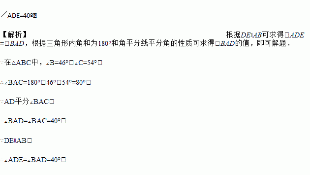 如图,在△ABC中,∠B=46°,∠C=54°,AD平分∠BAC,交BC于D,DE∥AB,交AC于E,则∠ADE的大小是多少?