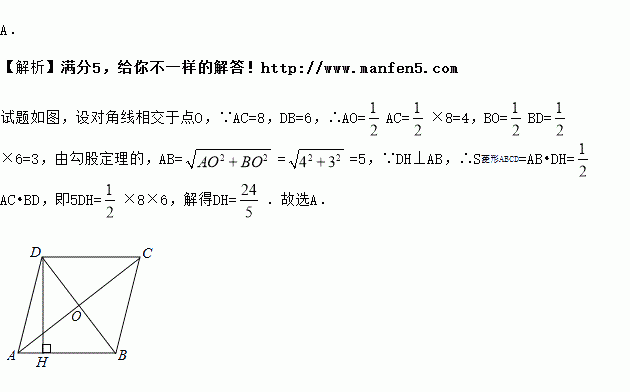 (4分)如图,四边形ABCD是菱形,AC=8,DB=6,DH⊥AB于H,则DH=( )