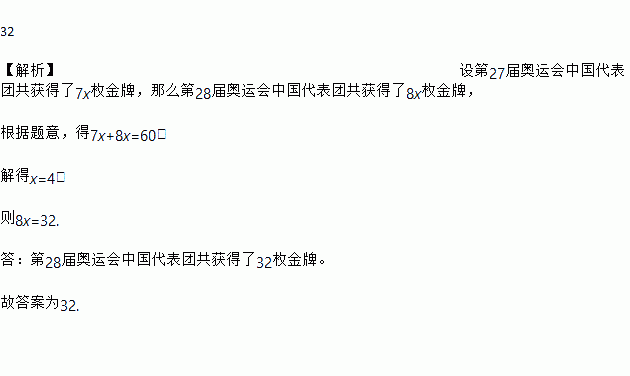 32 【解析】设第27届奥运会中国代表团共获得了7x枚金牌,那么第28届奥运会中国代表团共获得了8x枚金牌, 根据题意,得7x+8x=60, 解得x=4, 则8x=32. 答:第28届奥运会中国代表团共获得了32枚金牌。 故答案为32.