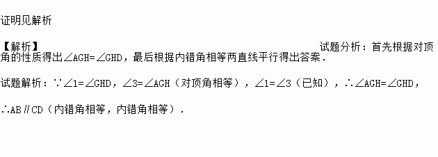 已知:如图,直线EF与AB、CD分别相交于点G、H,∠1=∠3。