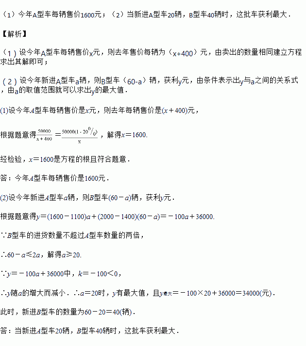 (1)今年A型车每辆售价多少元?(用列方程的方法解答)