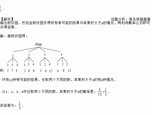 . 【解析】试题分析:首先根据题意画出树状图,然后由树状图求得所有等可能的结果与其乘积大于4的情况,再利用概率公式即可求得答案. 【解析】 画树状图得: ∵共有12种等可能的结果,任取两个不同的数,其乘积大于4的有6种情况, ∴从1、2、3、4中任取两个不同的数,其乘积大于4的概率是:=. 故答案为:.