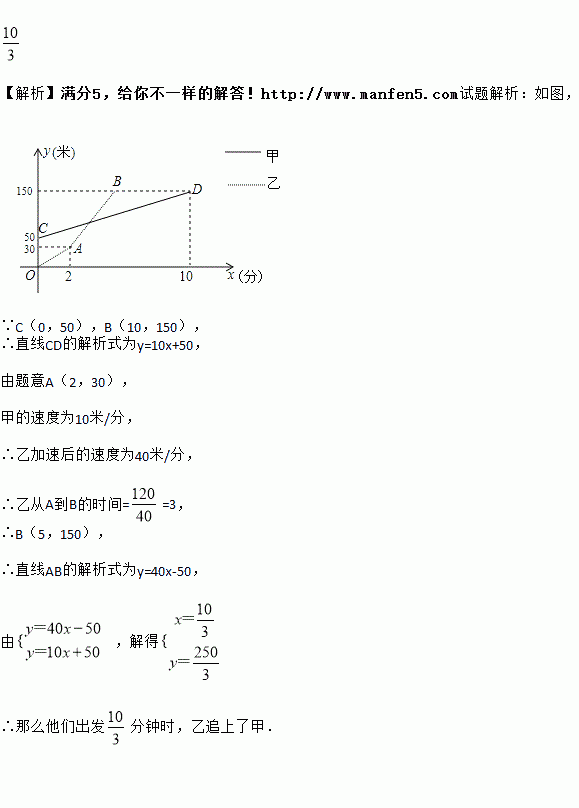 甲、乙两人分别从两地同时出发登山,甲、乙两人距山脚的竖直高度y(米)与登山时间x(分)之间的图象如图所示,若甲的速度一直保持不变,乙出发2分钟后加速登山,且速度是甲速度的4倍,那么他们出发_____分钟时,乙追上了甲.