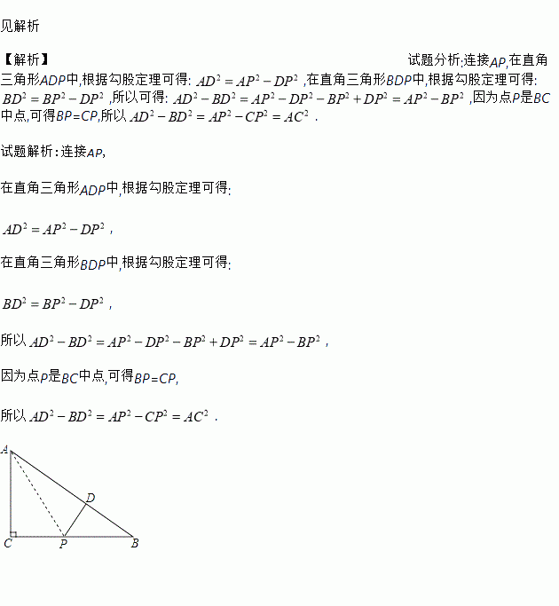 在△ABC中,∠ACB=90°,P为BC中点,PD⊥AB于D,求证:AD2﹣BD2=AC2 .