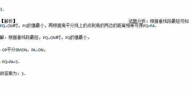 如图,OP平分∠MON,PA⊥ON于点A,点Q是射线OM上一个动点,若PA=3,则PQ的最小值为 .