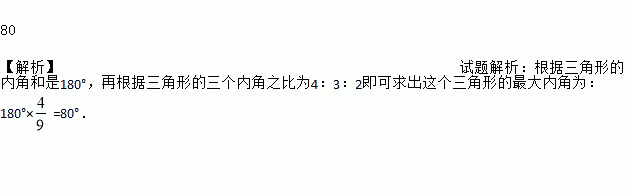若一个三角形的三个内角度数之比为4∶3∶2,则这个三角形的最大内角为_________度.