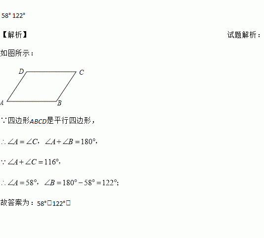 一个平行四边形两对角之和为116°,则相邻的两内角分别是__________和_________.