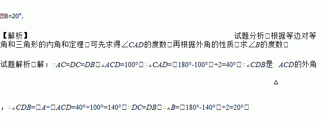 如图,在△ABC中,AC=DC=DB,∠ACD=100°,求∠B的度数.