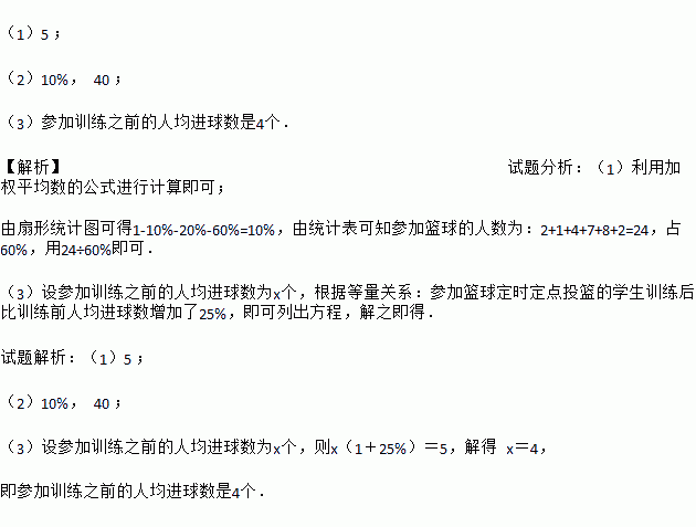 (3)根据测试数据,参加篮球定时定点投篮的学生训练后比训练前人均进球数增加了25%,求参加训练之前的人均进球类数.