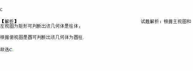 C 【解析】试题解析:根据主视图和左视图为矩形可判断出该几何体是柱体, 根据俯视图是圆可判断出该几何体为圆柱. 故选C.