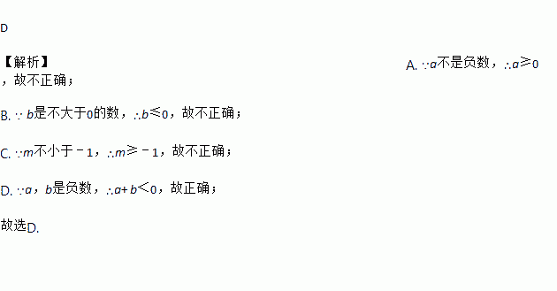C. m不小于﹣1,则m>﹣1 D. a,b是负数,则a+ b<0
