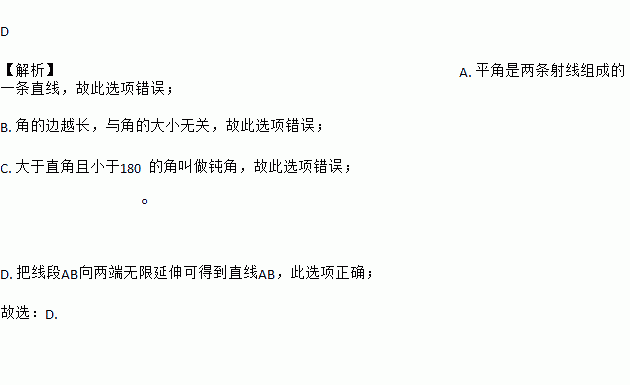 D 【解析】A. 平角是两条射线组成的一条直线,故此选项错误; B. 角的边越长,与角的大小无关,故此选项错误; C. 大于直角且小于180?的角叫做钝角,故此选项错误; D. 把线段AB向两端无限延伸可得到直线AB,此选项正确; 故选:D.