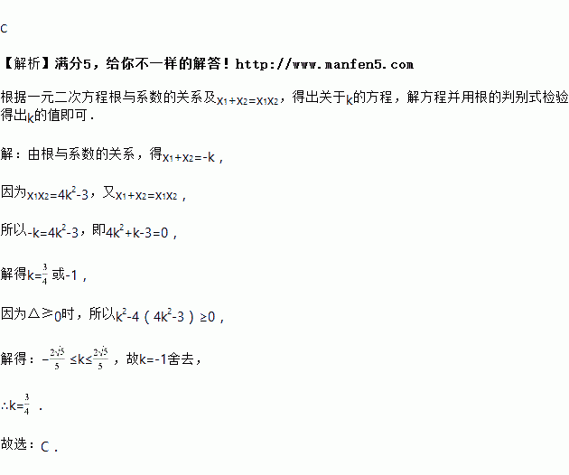 若关于x的一元二次方程x2+kx+4k2-3=0的两个实数根分别是x1,x2,且满足x1+x2=x1·x2,则k的值是().