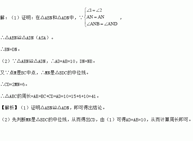 如图,M是△ABC的边BC的中点,AN平分∠BAC,BN⊥AN于点N,延长BN交AC于点D,已知AB=10,BC=15,MN=3
