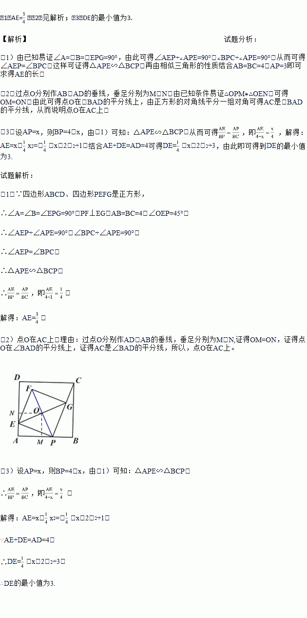(3)在点P从点A到点B的运动过程中,正方形PEFG也随之运动,求DE的最小值.