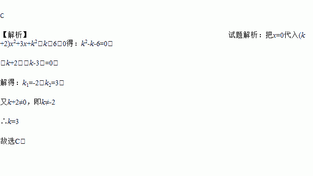 若关于x的一元二次方程(k+2)x2+3x+k2-k-6=0必有一根为0,则k的值是( )