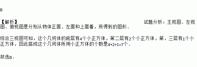 已知:如图,是由若干个大小相同的小正方体所搭成的几何体的三视图,则搭成这个几何体的小正方体的个数是( )