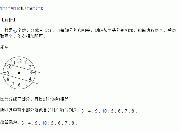 如图,时钟的钟面上标有1,2,3,…,12,共12个数,一条直线把钟面分成两部分.请你再用一条直线分割钟面,使钟面被分成三个不同的部分且各部分所包含的几个数的和都相等,则另外两个部分所包含的几个数分别是____________.
