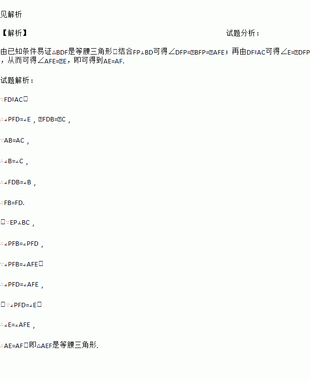 如图,在ABC中,AB=AC,点E在CA的延长线上,EP⊥BC,垂足为P,EP交AB于点F,FD∥AC交BC于点D.求证:△AEF是等腰三角形.