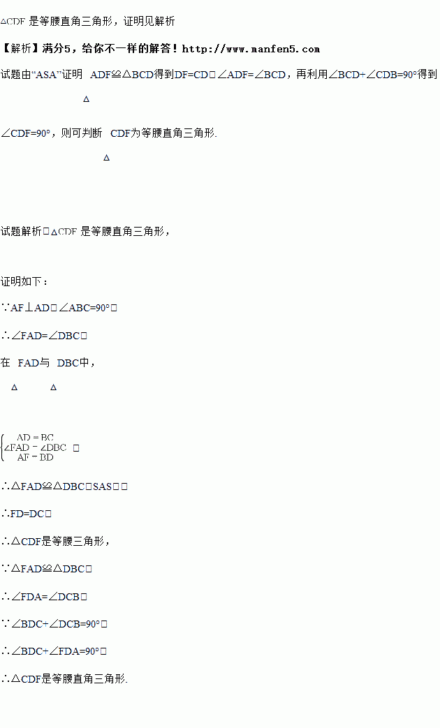 如图,已知∠ABC=90°, D是直线AB上的点,AD=BC ,过点A作AF⊥AB,并截取AF=DB ,连接DC、DF、CF ,判断△CDF的形状并证明.