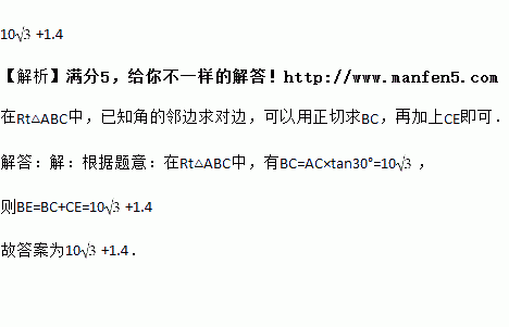 初三班研究性学习小组为了测量学校旗杆的高度(如图),他们在离旗杆底部点米的处,用测角仪测得旗杆顶端的仰角为,已知测角仪器高米,则旗杆的高为________米(结果保留根号).