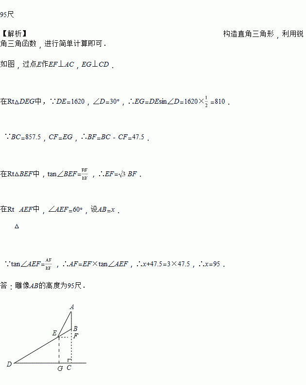 如图,某班数学兴趣小组利用数学活动课时间测量位于山顶的电视塔AB的高度,已知山的坡度为30°,山高857.5尺,组员从山脚D处沿山坡向着电视塔方向前进1620尺到达E点,在点E处测得电视塔顶端A的仰角为60°,求电视塔AB的高度.