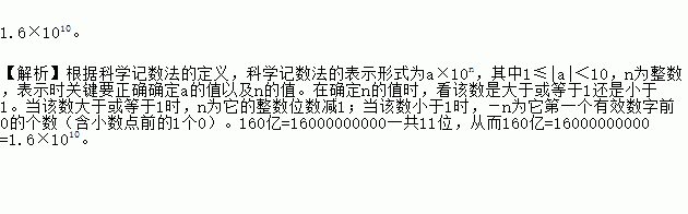 1.6×1010。 【解析】根据科学记数法的定义,科学记数法的表示形式为a×10n,其中1≤|a|<10,n为整数,表示时关键要正确确定a的值以及n的值。在确定n的值时,看该数是大于或等于1还是小于1。当该数大于或等于1时,n为它的整数位数减1;当该数小于1时,-n为它第一个有效数字前0的个数(含小数点前的1个0)。160亿=16000000000一共11位,从而160亿=160000000...