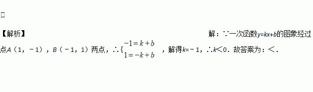 若一次函数y=kx+b的图像经过A (1,-1),B (-1,1) 两点,则k______0 (填“>”或“<”) .
