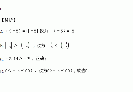 A. +(﹣5)=+|﹣5| B. > C. ﹣3.14>﹣π D. 0<﹣(+100)