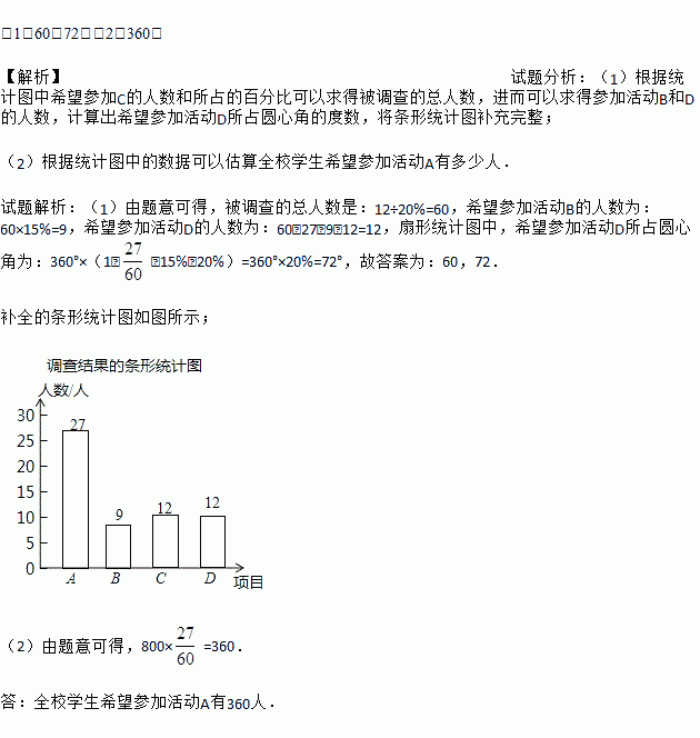 (1)如图,希望参加活动C占20%,希望参加活动B占15%,则被调查的总人数为 人,扇形统计图中,希望参加活动D所占圆心角为 度,根据题中信息补全条形统计图.