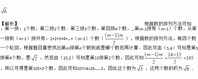 如图,将1, , , 按下列方式排列.若规定(m,n)表示第m排从左向右第n个数,则(5,4)与(15,2)表示的两数之积是 _________.