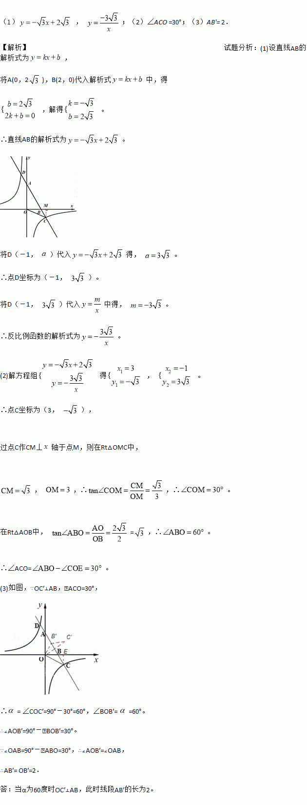 (3)将△OBC绕点O逆时针方向旋转α角(α为锐角),得到△OB′C′,当α为多少度时OC′⊥AB,并求此时线段AB′的长.