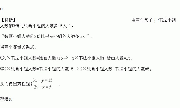某班有若干个活动小组,其中书法小组人数的3倍比绘画小组的人数多15人,绘画小组人数的2倍比书法小组的人数多5人,问:书法小组和绘画小组各有多少人?若设书法小组有x人,绘画小组有y人,那么可列方程组为( )