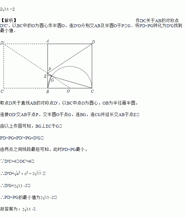 如图,已知正方形ABCD的边长是4,点E是AB边上一动点,连接CE,过点B作BG⊥CE于点G,点P是AB边上另一动点,则PD+PG的最小值为_____.